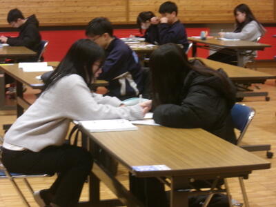 視聴覚室に1・2年生が集まりテスト前の最後の仕上げをしています。