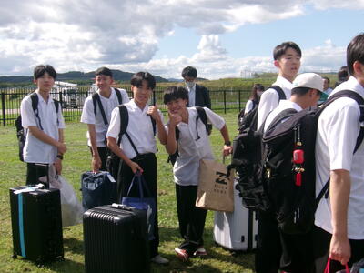 出発のときに集まった空港の芝生の場所へ集合し、先生からのお話があります。