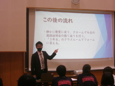 高校入試について進路担当の笹川先生からパワーポイントを使って説明されています。