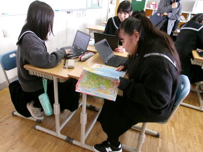 数学ですが地図帳を出しての学習です。何かを調べています。