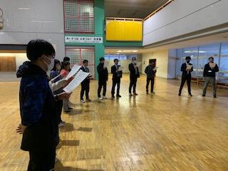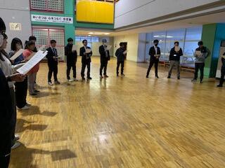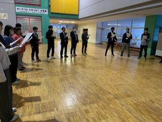 会議の中で音楽担当の給前先生より、校歌を大きな声で歌う生徒にしたいと熱い思いから、「校歌強靭化計画」が提案されました。会議終了後にさっそく給前先生の指導のもと、大ホールで先生の合唱練習が始まりました。
