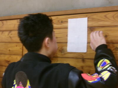 ティッシュペーパーを壁において息を吹きかけ5秒間、10秒間落ちないように・・・