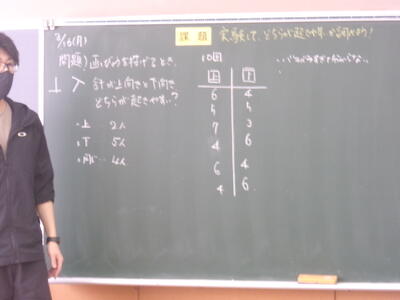 画鋲を投げて針が上向きか下向きのどちらが起きやすいかの実験しています。