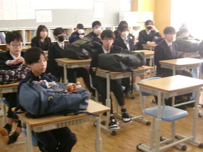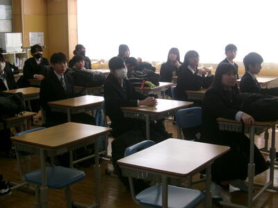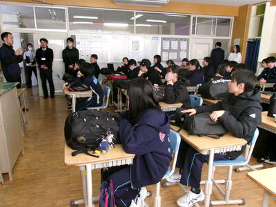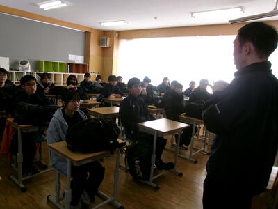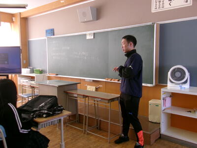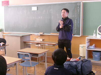 紋別市地域スポーツクラブを担当するリーフラス株式会社の浅井さんから1・2年生の全クラスに体験会の説明がありました。